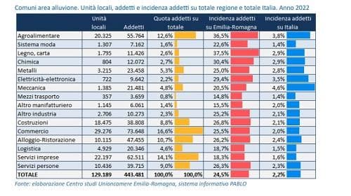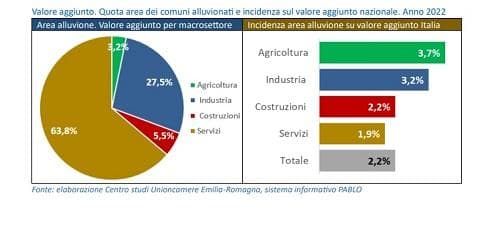 Secondo le elaborazioni del Centro studi di Unioncamere Emilia-Romagna, nel 2022 il valore aggiunto, la ricchezza creata, dai comuni colpiti dall'alluvione ammontava a oltre 38 miliardi di euro, il 24% del Pil regionale, il 2,2% di quello nazionale.