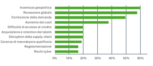Una situazione simile si riscontra anche in Italia, dove, complice la struttura del tessuto produttivo dominato da piccole PMI parte di complesse supply e value chain, l’incertezza geopolitica limiterà la capacità delle aziende di centrare i propri obiettivi strategici a detta del 73% dei CFO italiani (+15 p.p. rispetto alla media europea).