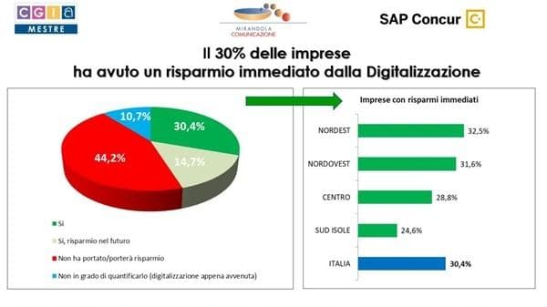 Il 30,4% delle imprese ha infatti riscontrato un risparmio immediato dalla digitalizzazione, più evidente al Nord (Nord Est 32,5% e Nord Ovest 31,6%) rispetto al Centro Italia (28,8%) e nel Mezzogiorno (24,6%).