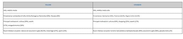 La regione conferma la propria vocazione multi-attrattiva, con un interesse trasversale per cultura, shopping, enogastronomia, eventi. Nel luogo di vacanza il turista scopre poi altri interessi e si dedica a escursioni e gite di interesse naturalistico (57%), turismo balneare/lacuale (34%), attività sportive (13,2%).