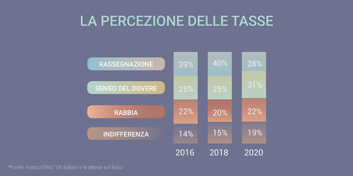 L’incertezza è il sentimento che emerge prevalentemente dalle risposte delle famiglie italiane, che in oltre il 50% dei casi dichiarano di aver avuto difficoltà a pagare le tasse quest’anno. Non a caso - infatti - è stata confermata la tendenza ad assumere comportamenti prudenti volti alla riduzione delle spese: il 53% dei rispondenti afferma di aver eliminato o ridotto voci di consumo non necessarie. Ciononostante le tasse rimangono una “questione di dovere” per gli italiani (31%), di poco inferiore la percentuale di coloro che si dichiarano invece rassegnati di fronte all’appuntamento fisso con l’Agenzia delle Entrate (28%). Piccole imprese e famiglie sono le categorie che soffrono maggiormente il peso del fisco: dalla ricerca emerge chiaramente che il sistema sia percepito come ingiusto e da riformare profondamente.
