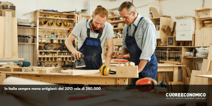 Cresce il lavoro dipendente ma diminuisce quello degli artigiani: tra il 2013 e il 2022 gli artigiani sono diminuiti di quasi 280.000 unità (-15,24%), un numero che supera gli abitanti della città di Venezia, per attestarsi poco sopra quota 1,54 milioni.