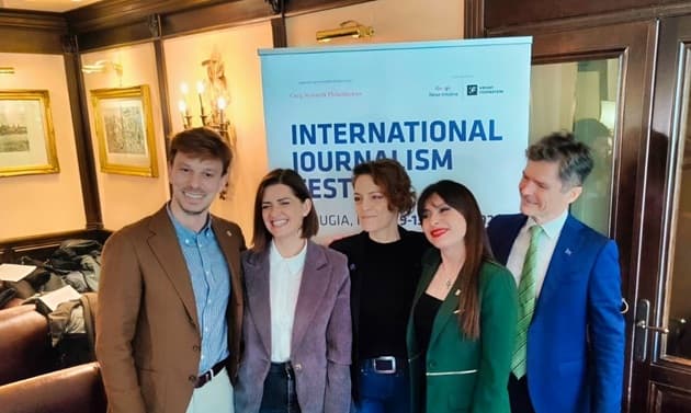 (Da Sx.Tommaso Bori, Vicepresidente Regione Umbria; Vittoria Ferdinandi, Sindaca di Perugia; Arianna Ciccone, Organizzatrice Festival Internazionale del Giornalismo; Stefania Proietti, Presidente Regione Umbria; Christopher Potter, Organizzatore Festival Internazionale del Giornalismo)
