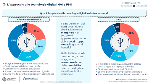 Secondo quanto emerge, tra le piccole e medie imprese italiane è cresciuta la consapevolezza che digitalizzarsi, innovare i propri processi sia ormai una priorità. Meno della metà delle Pmi, infatti, considera la digitalizzazione ancora marginale rispetto ai propri settori di appartenenza oppure con costi ancora troppo elevati rispetto ai benefici.