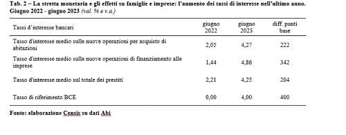 In sostanza, il tasso medio sul totale dei prestiti è passato dal 2,21 percento di giugno 2022 al 4,25 di giugno di quest’anno, sempre a seguito dei continui rialzi dei tassi di interesse decisi dalla Bce negli ultimi 12 mesi.