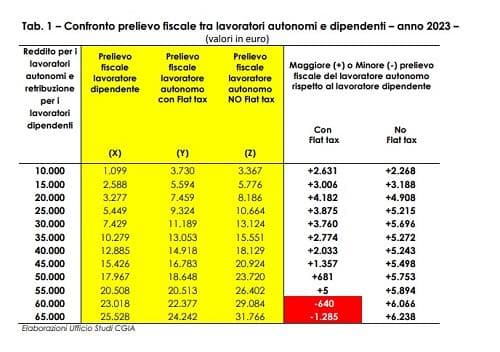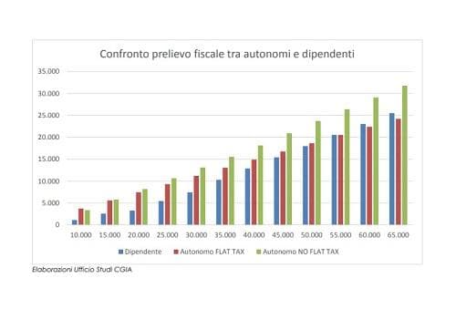 Con l’innalzamento della flat tax fino a 85.000 euro di fatturato, gli autonomi continuano a pagare più tasse dei lavoratori dipendenti. Solo nella fascia di reddito tra i 60 e i 65.000 euro, le partite Iva che si avvalgono della tassa piatta pagano meno. Il dato emerge dal calcolo realizzato dalla Cgia di Mestre.