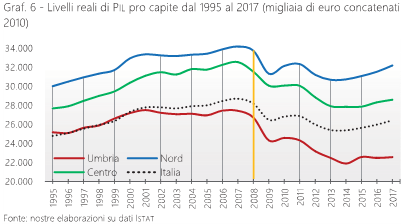L’allarme lanciato dalla CGIA di Mestre sul ritorno del PIL pro-capite umbro ai livelli del 1988 non sorprende. Anche senza l’impatto del COVID, la situazione fotografata dall’AUR (cfr. figura) evidenzia che la regione era già arretrata (dai 25 mila euro del 1995 ai 22 mila euro del 2017) prima di questa pandemia che, ad onor del vero, sta sconquassando i pilastri dell’economia mondiale e mettendo in crisi anche i sistemi produttivi più avanzati.