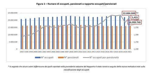 In particolare, emergono alcuni punti chiave: aumenta ancora una volta, il numero di pensionati, che salgono dai 16,041 milioni del 2020 ai 16,099 del 2021 (+57.547 unità); dopo la forte crisi causata da Covid-19, torna a crescere sensibilmente (oltre 550mila i lavoratori “recuperati”) il numero di occupati, che a fine giugno 2022 superano i 23 milioni; migliora anche il rapporto occupati e pensionati che nel 2020 si fermava a 1,384, mentre nel 2021 arriva a 1,4215.