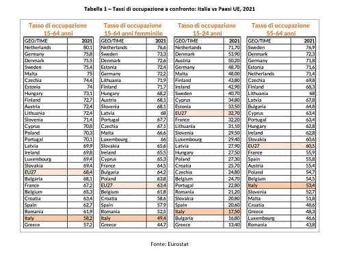Secondo i dati Eurostat al 2021, il nostro Paese era infatti agli ultimi posti per occupazione globale, distante di 10 punti percentuali dalla media europea (58,2% l’Italia e 68,4% la media a 27 Paesi), per occupazione femminile (qui la differenza è di circa 14 punti rispetto alla media europea) e giovanile (17,50% contro il 32,70% della media UE).
