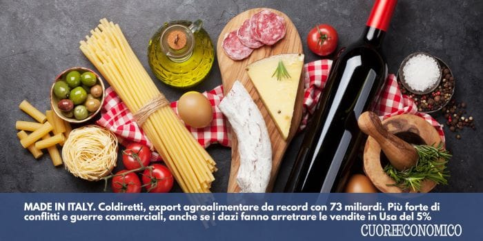 MADE IN ITALY. Coldiretti, export agroalimentare da record con 73 miliardi. Più forte di conflitti e guerre commerciali, anche se i dazi fanno arretrare le vendite in Usa del 5%