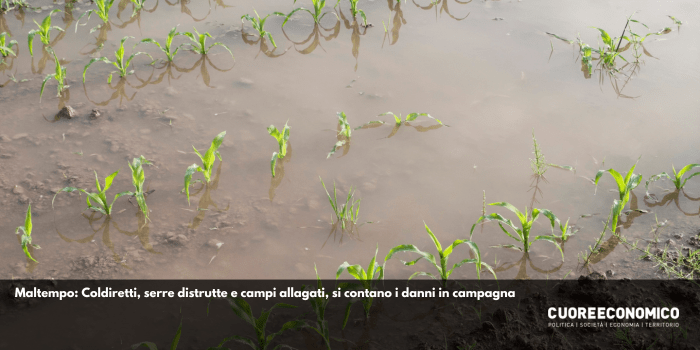 L’ondata di maltempo abbattutasi sull’Italia non risparmia le campagne dove si segnalano gravissimi danni tra campi allagati, serre distrutte e colture devastate, bloccando in alcuni territori anche la vendemmia, con i vigneti impraticabili per le operazioni di raccolta