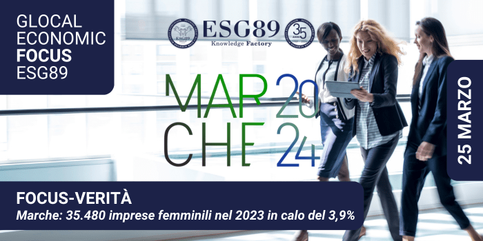 Il Report Camera Marche rileva una diminuzione di 1200 aziende femminili al termine del 2023. Un dato significativo per l’analisi riportata dal GLOCAL ECONOMIC FOCUS - MARCHE 2024, l’inserto digitale di ESG89 disponibile dal 25 marzo, incentrato sullo stato di salute della regione