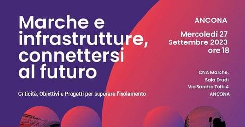 “Marche e infrastrutture: connettersi al futuro: criticità, obiettivi e progetti per superare l’isolamento” è il tema dell’assemblea pubblica di Cna Marche in programma Mercoledì 27 settembre alle 18 alla Sala Drudi di Ancona dell’associazione artigiana.