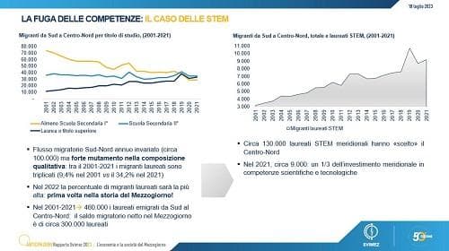 La Svimez stima che nel 2022, per la prima volta nella storia delle migrazioni interne italiane, la quota di laureati sul totale degli emigrati meridionali supererà quelle relative a titoli di studio inferiore.