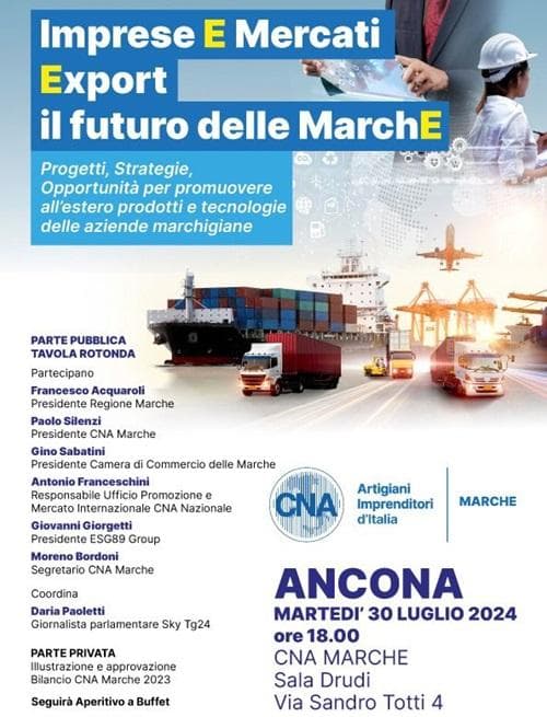 “Imprese e Mercati Export, il futuro delle Marche” è l’evento a cui prenderanno parte la Regione e la Camera di Commercio delle Marche insieme a CNA Marche e CNA Nazionale che si riuniranno nella città di Ancona per discutere della posizione delle Marche nel mercato internazionale.