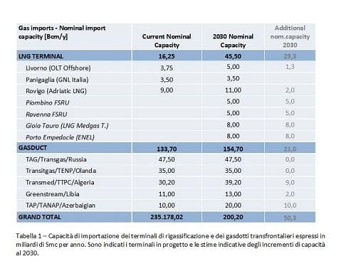 La capacità di rigassificazione nominale dell’Italia è di oltre 16 BCM/y, e contribuisce a compensare le importazioni russe, che nel 2021 ammontavano a circa 47 BCM/y a fronte di una importazione totale di 72 BCM/y.