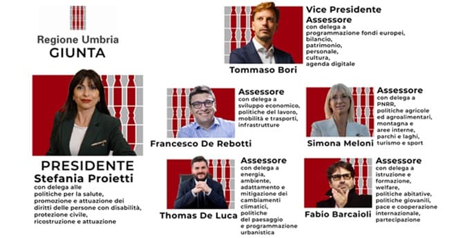La presidente della Regione Umbria, Stefania Proietti ha nominato gli Assessori della nuova Giunta Regionale, definendoli "Persone capaci e competenti che rappresentano le grandi comunità politiche che hanno collaborato per ottenere questo risultato elettorale e che ora si accingono a lavorare insieme per un’azione amministrativa che avrà come stella polare quella della collegialità"
